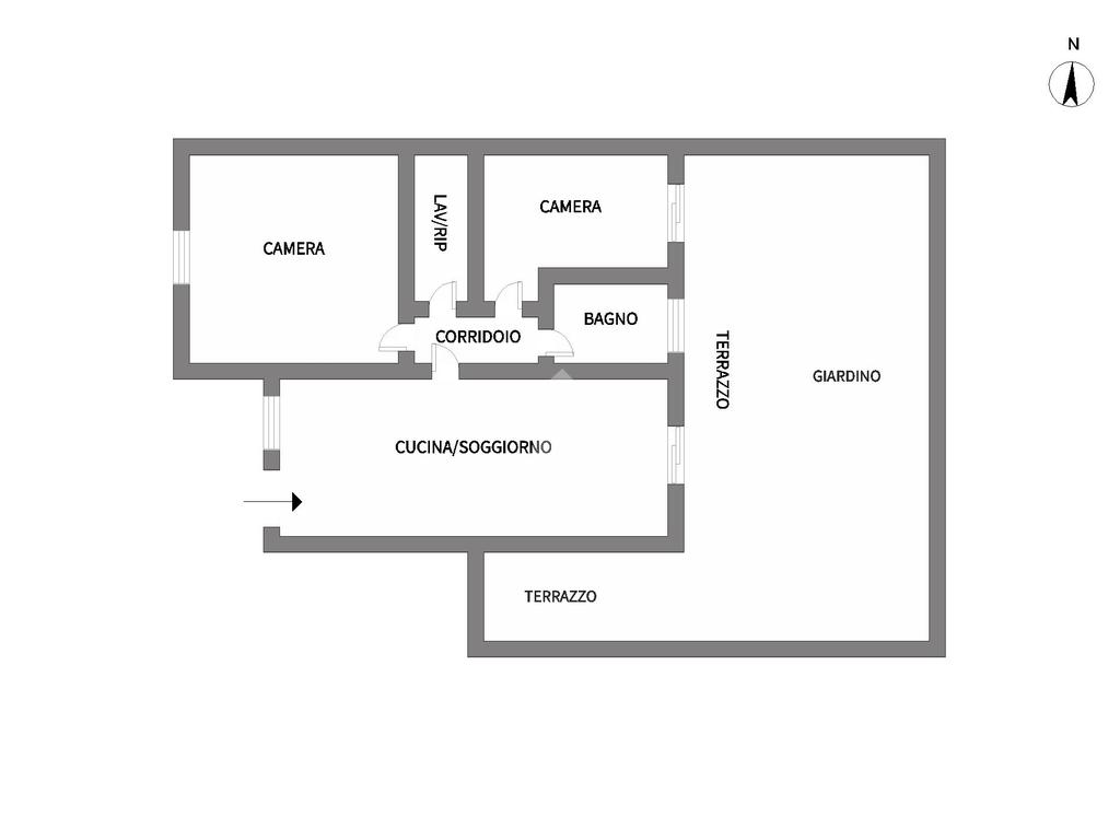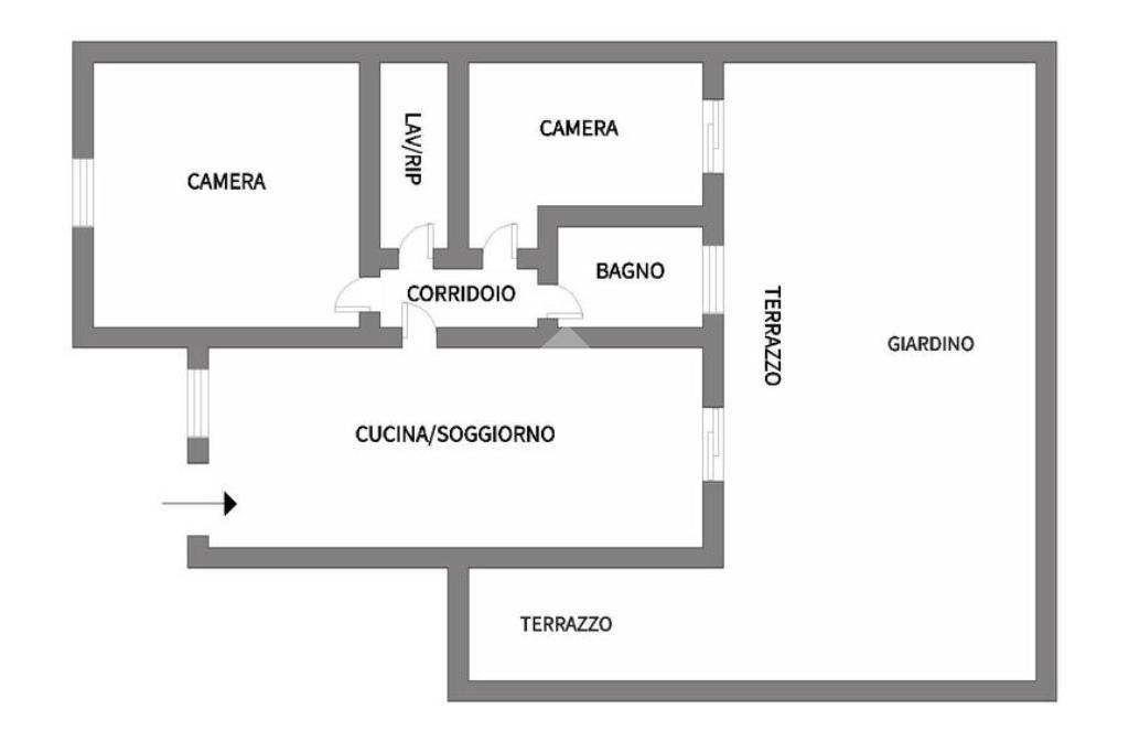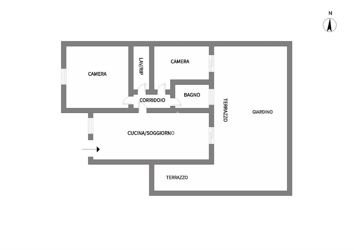 L'appartamento è composto da ingresso su ampia ed accogliente cucina/soggiorno, due camere da letto, bagno con doccia e lavanderia-ripostiglio. Di pertinenza 75 mq di spazio esterno suddiviso tra terrazzo pavimentato e giardino.